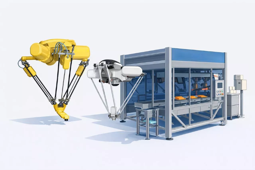 Три рычага управляются приводами, расположенными на неподвижной базе, что обеспечивает высокую скорость (до 10 м/с) и точность благодаря малой инерции движущихся частей. Рабочий орган перемещается в пространстве с высокой маневренностью. Оптимальны для высокоскоростных операций захвата и сортировки легких объектов.