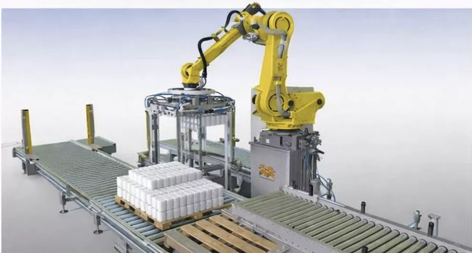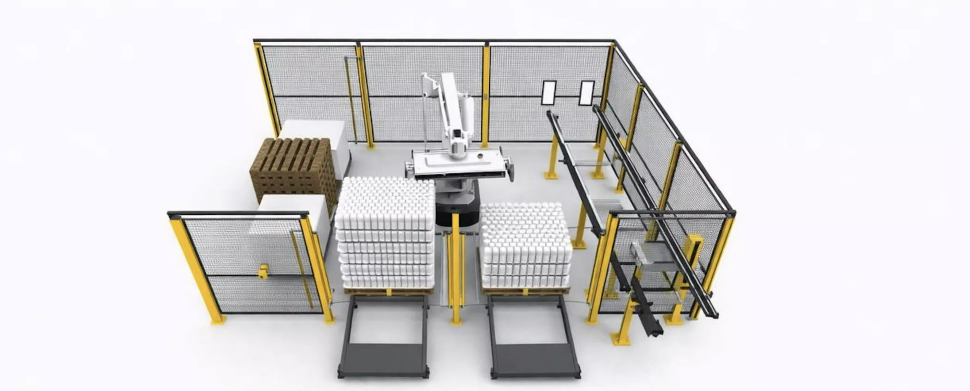 Робот-манипулятор укладывает или разбирает паллеты с тарой, обеспечивая эффективную работу с бутылками и банками на конвейерных линиях. Депаллетайзеры разгружают тару с паллет и устанавливают на конвейер.