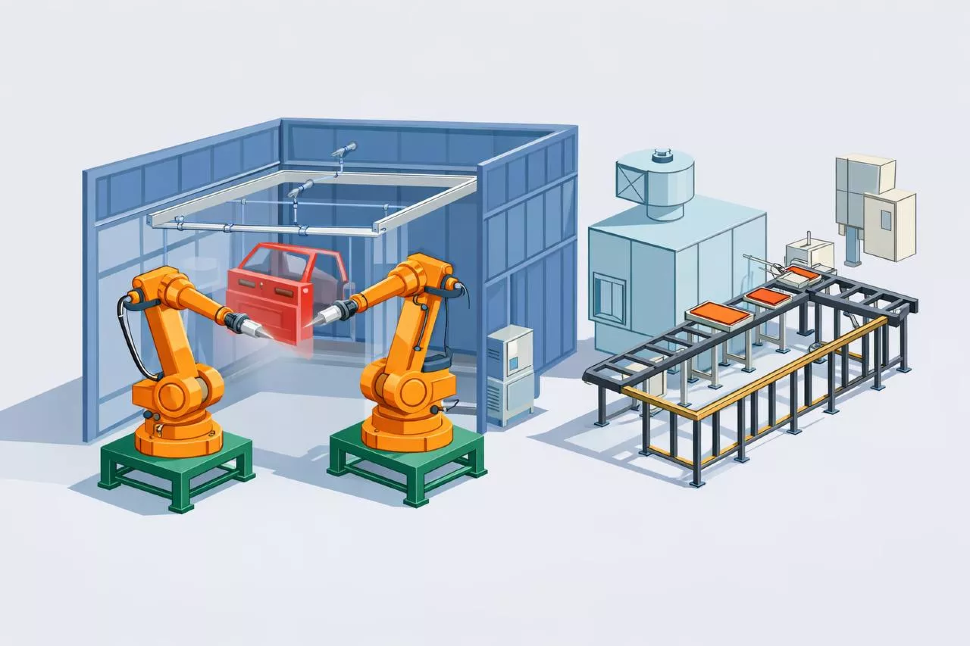 Изделия перемещаются по конвейерной системе, покрасочные роботы наносят покрытие в автоматическом режиме. Роботы легко перепрограммируются под новые изделия, обеспечивают круглосуточную работу, равномерное нанесение с минимальным расходом материалов и без подтеков.
