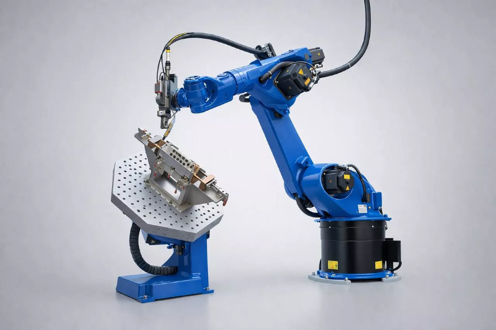 6-осевой сварочный робот выполняет сварку по запрограммированным траекториям, позиционер поворачивает заготовку для обеспечения оптимального доступа сварочной горелки ко всем швам. Станция очистки горелки обеспечивает стабильность процесса.