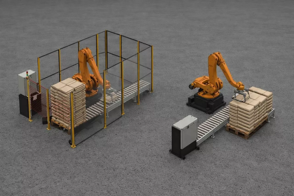 Мешки поступают с линии фасовки на конвейерную систему, прокатной конвейер формирует ровную поверхность мешка (приминает) для устойчивости укладки. Робот с пневмомеханическим захватом забирает мешок и укладывает на паллету по заданному шаблону. Оператор по сигналу меняет паллеты вне опасной зоны.