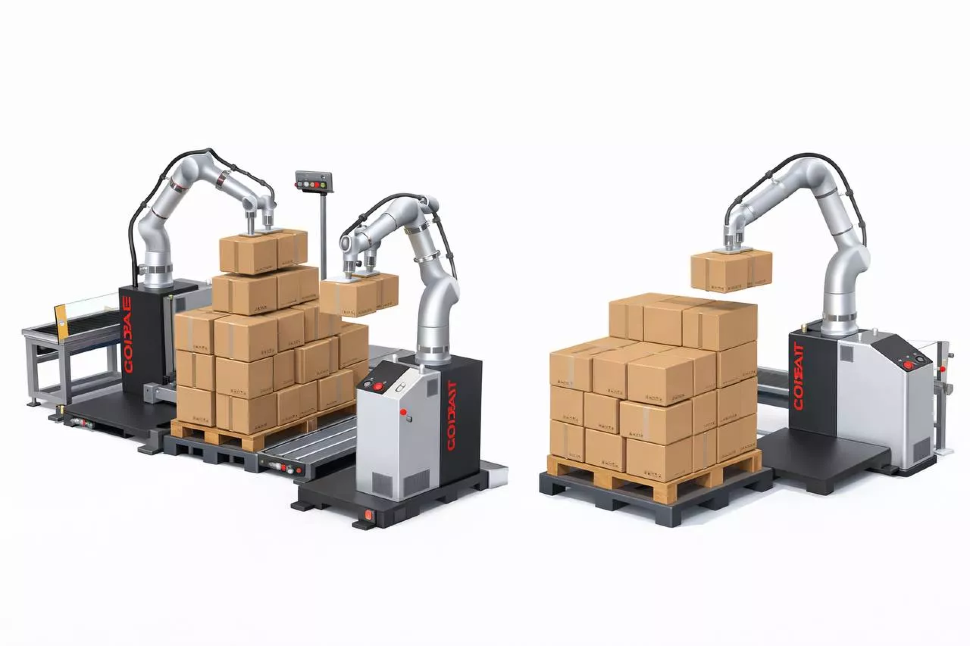 Система, в которой коллаборативный робот помогает оператору в процессе укладки товаров на поддоны.